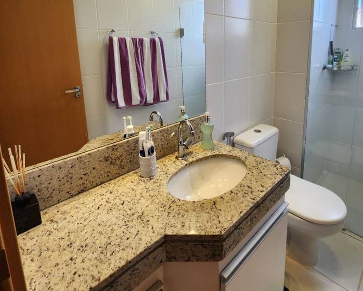 Banheiro social com bancada em granito, armários e box em blindex